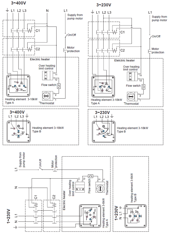 Dépend de la tension et des phases, il est fortement recommandé de consulter un électricien si l’on n’a pas d’expérience dans le domaine (les schémas de câblage correspondants sont joints en bas) |